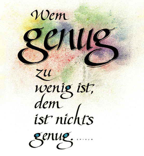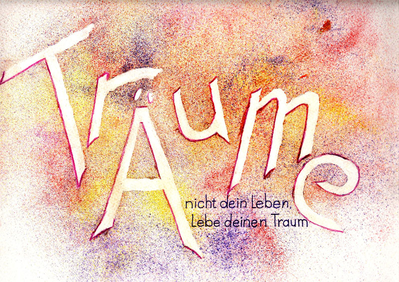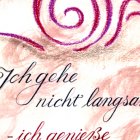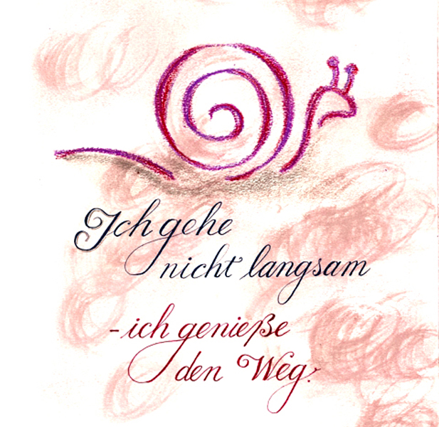 Neben Karten zu besonderen Anlässen erstellt sie gerne Schriftbilder, die sie jeweils am Jahresende zu einem Kalender zusammenfasst. Für sie ist kalligrafisches Schreiben und Gestalten der Texte ein äußerst entspannendes Hobby und ein perfekter Ausgleich zum hektischen Alltag.